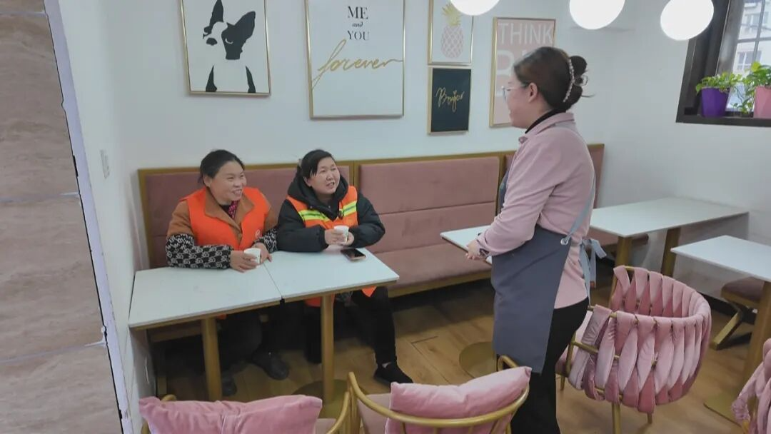 位于延安路的吉吉加商铺特意将店内一处区域贴上“暖心驿站”标识,方便户外工作者歇脚。桌椅、物资、标识,每一处细节都体现了对户外工作者的关切。环卫工人王志英在这里找到了归属,她说:“心里特别暖和。我会更加努力地打扫街道,回报这份温暖。”