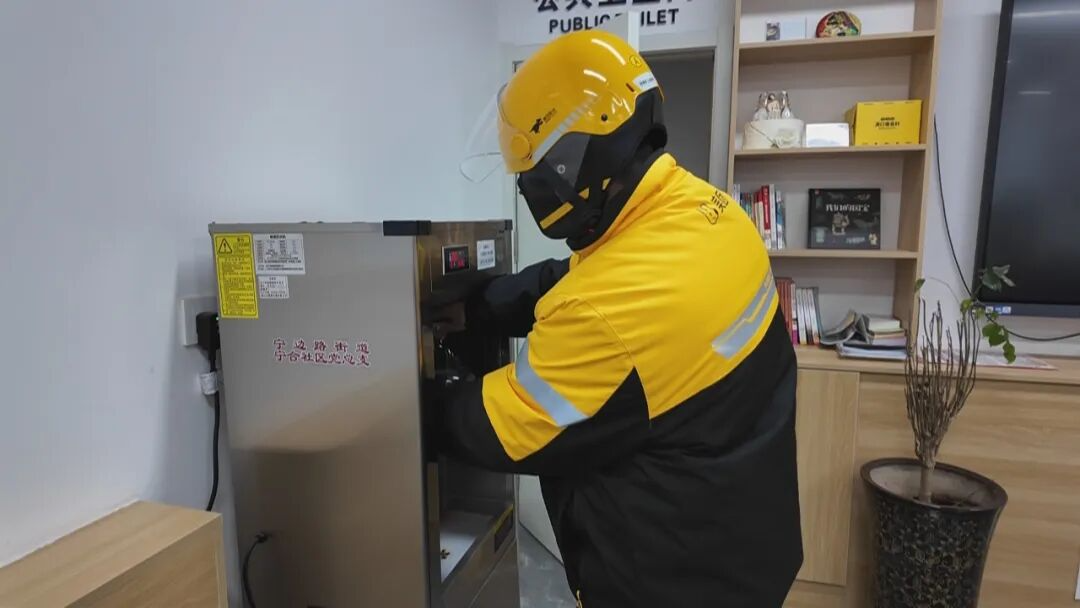 在宁边路宁合社区党群服务驿站,刚送完一单外卖的骑手正在这里给手机充电。驿站配备充电设备、热水和休息区,成为骑手们途中的“加油站”。