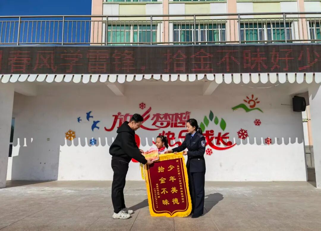 3月23日,昌吉市第八小学举行了一场特别的表彰仪式,北京南路街道派出所民警来到学校,亲手将一面印着“少年美德 拾金不昧”的锦旗赠予了该校9岁学生邓涵州,并为她送上了学习用品,这场表彰源于两天前在滨湖河中央公园发生的一件暖心事。