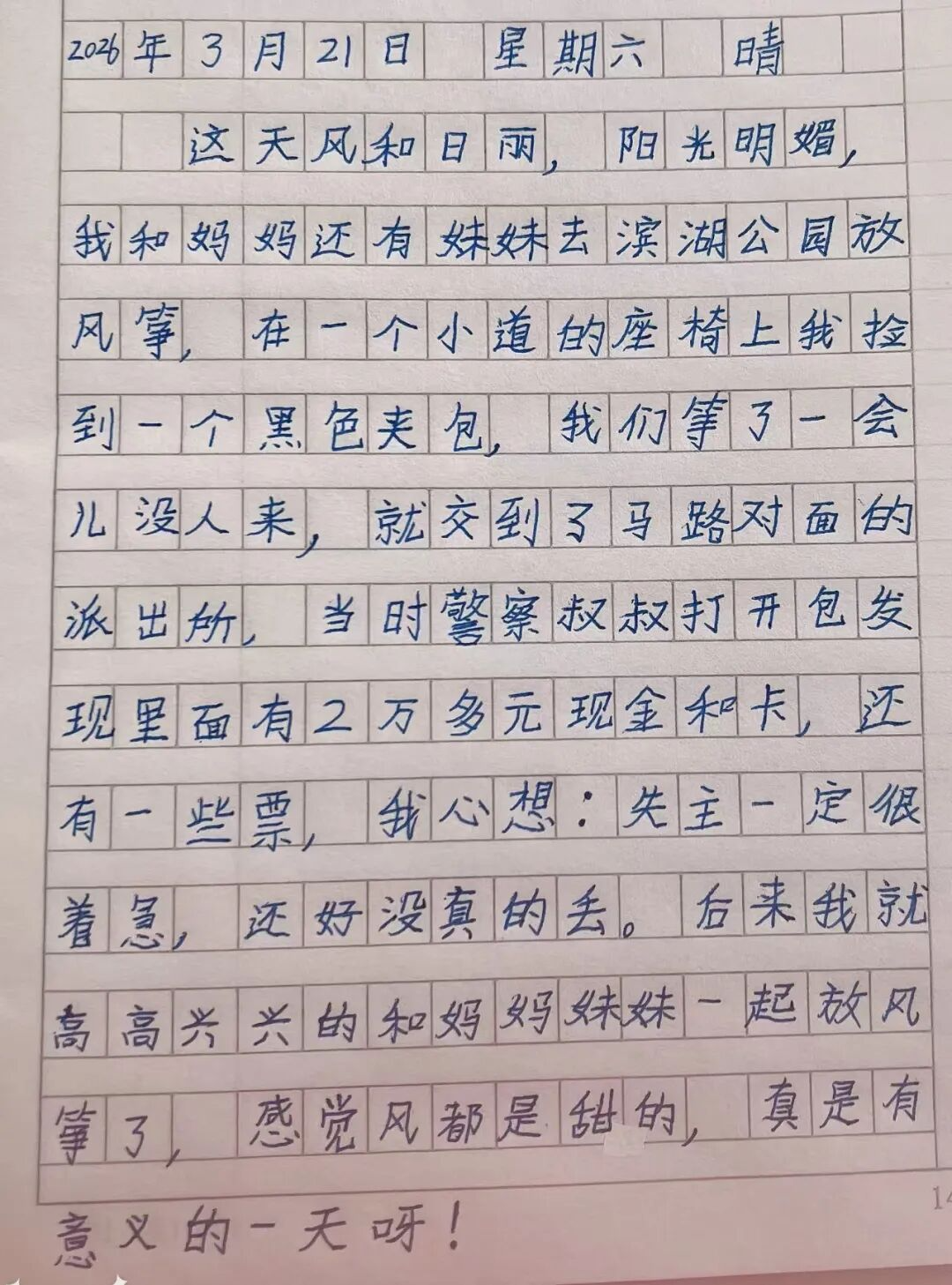 面对采访,邓涵州真诚地说:“当时我想,失主丢了东西,肯定特别着急。我看到公园对面有一个派出所,就亲手把这个包交到警察叔叔手里。后来我得知失主认领了,心里特别高兴和自豪。爸爸妈妈和老师一直教育我,要做一个拾金不昧的好孩子,我也会把这份拾金不昧的精神传递给更多同学。”那天回到家中,她把这件事写进日记里。她自豪地给记者分享了日记中的内容,朴实而真挚:“把钱包交给警察叔叔后,我就高高兴兴地和妈妈、妹妹一起放风筝了,感觉风都是甜的,真是有意义的一天啊!”