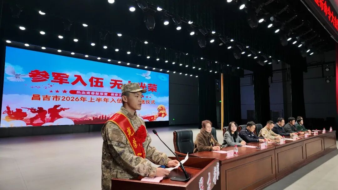 昌吉市委常委、市人武部政委张贤锋宣读2026年上半年新兵入伍名单,随后,与会领导及亲属代表走上前,为新兵们佩戴光荣花、系上绶带,送上入伍纪念品和饱含心意的拥军鞋垫。市领导王骏致欢送词,勉励新兵牢记从军爱国初心,在军营勤学苦练,磨砺坚强意志,锻造过硬本领,在建功立业中绽放青春。